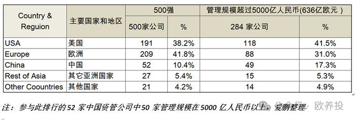 从国家地域角度看,美国与欧洲基本平分秋色,各约占40%,中国占比约为10.4%。但由于中国上榜的机构绝大多数为管理规模在5000亿人民币/636亿欧元以上,若以此为界,中国公司的占比就从10.4%提升至了17.3%。
