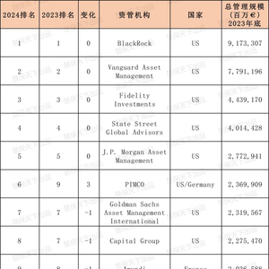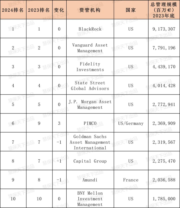 贝莱德绝对优势持续第一,美国公司霸榜前10占9,中国超5000亿管理规模占17.3%