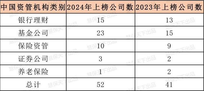 具体来看,这52家机构包括四类资管公司:23家基金公司,10家保险资产管理公司及1家养老保险公司,15家银行理财公司,3家证券商。这52家机构2023年底总资管规模为约为72.4万亿人民币,其中参与了2023年排名的41家机构总规模同比增长了1.7%。