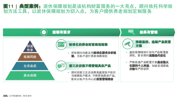 该机构将与客户建立长期的信任关系作为工作重点,重视通过咨询服务为客户提供全方位的理财规划与建议,以帮助客户实现财富目标。以其最具特色的退休保障规划方案为例,一方面,围绕养老客群“基本保障、生活品质、抵御风险和财富传承”四个层次,整合集团内外部生态能力,为客户定制财富管理解决方案;另一方面,在实践中构建了“流程+跟踪+工具”的配套机制,以保证“客户至上”理念的切实落地与执行(参阅图11)。