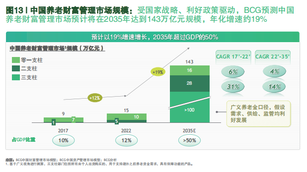 当前国内对养老金融并没有明确的官方定义,BCG整理并吸收国内外养老金融界定逻辑,将其分为养老金管理、养老财富管理、养老生态金融三个层次(参阅图12)。其中,养老金管理是面向养老三大支柱体系提供账户管理、投资管理等金融服务;养老财富管理包含以养老需求为导向的所有财富管理金融服务;养老生态金融则主要指为养老生态服务产业提供的多元投融资服务(包含养老产业发展相关金融服务)。根据BCG对中国养老财富管理市场(含养老金管理)的长期跟踪和测算得出,2022年中国养老财富管理市场规模约15万亿元,预计2035年市场规模将达到143万亿元,市场前景广阔(参阅图13)。