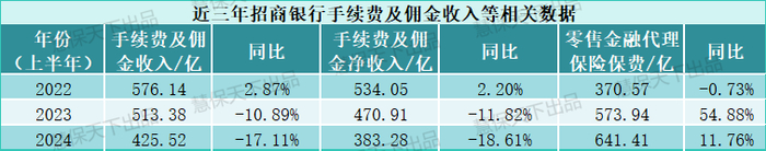 被称为“零售之王”的招商银行,2024年上半年的中收业务也出现了两位数的下滑:手续费及佣金净收入383.28亿元,同比下降18.61%。