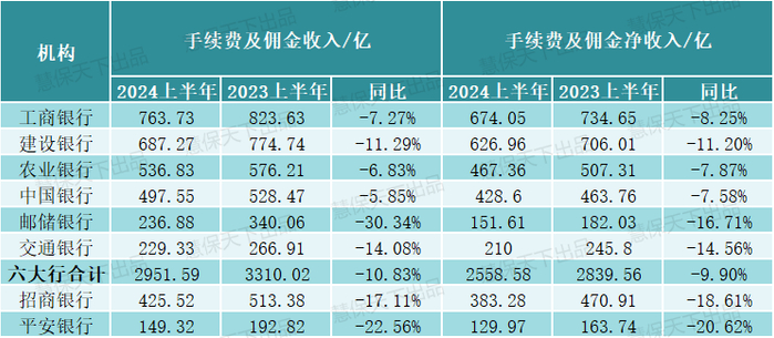在保险公司努力压降负债成本,降低银保手续费率的情况下,各大银行今年上半年的中收业务表现如何?为了明晰2024年上半年银行业中间业务的真实情况,“慧保天下”对国有六大行及股份制银行中较有代表性的招商银行和平安银行的中收情况进行了梳理。
