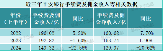 2024年上半年,平安银行中收规模态势由去年同期的正增长转为负增长,手续费及佣金收入149.32亿元,降幅高达22.56%,手续费及佣金净收入129.97亿元,同比下降20.62%。