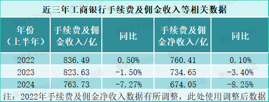 2024年上半年进一步下滑,工商银行手续费及佣金净收入为674.05亿元,同比减少60.6亿元,下降幅度达到8.25%。对此,其在半年报里表示,是受公募基金费率改革、落实保险“报行合一”政策、资本市场波动、投资者风险偏好变化等因素影响。