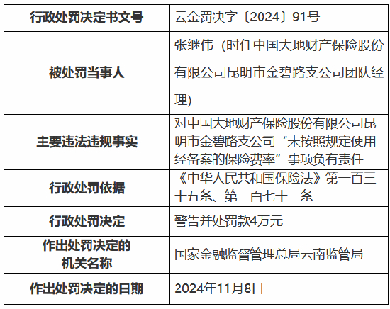 12月2日金融一线消息,中国大地财产保险股份有限公司昆明市金碧路支公司“未按照规定使用经备案的保险费率”。张继伟(时任中国大地财产保险股份有限公司昆明市金碧路支公司团队经理)对公司“未按照规定使用经备案的保险费率”事项负有责任,受到警告并被罚款4万元。