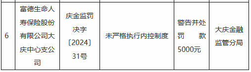 富德生命人寿大庆中心支公司因未严格执行内控制度被罚5000元