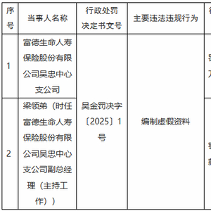 1月20日金融一线消息,国家金融监督管理总局固原监管分局行政处罚信息公开表显示,富德生命人寿保险股份有限公司吴忠中心支公司因编制虚假资料被罚款10万元。梁领弟(时任富德生命人寿保险股份有限公司吴忠中心支公司副总经理(主持工作))对上述违法违规行为负有责任,受到警告并被罚款1万元。