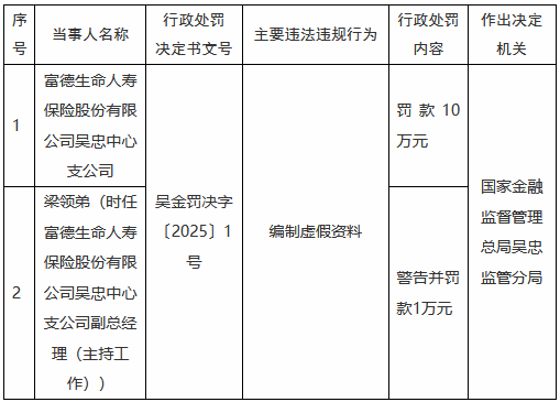 富德生命人寿吴忠中心支公司因编制虚假资料被罚10万元