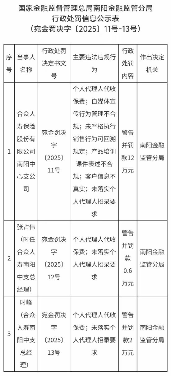 合众人寿南阳中心支公司被罚12万元:个人代理人代收保费 自媒体宣传行为管理不合规等