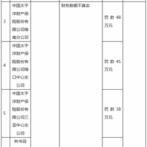 2月7日金融一线消息,国家金融监督管理总局海南监管局行政处罚信息公示表显示,因财务数据不真实,中国太平洋财产保险股份有限公司海南分公司被罚款48万元,中国太平洋财产保险股份有限公司海口中心支公司被罚款45万元,中国太平洋财产保险股份有限公司三亚中心支公司被罚款38万元。