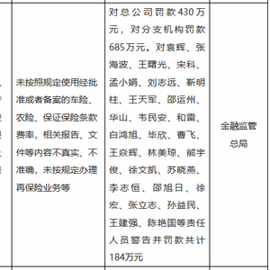 因此,金融监管总局决定对总公司罚款430万元,对分支机构罚款685万元。对袁辉、张海波、王曙光、宋科、孟小娟、刘志远、靳明柱、王天军、邵运州、华山、韦民安、和雷、白鸿旭、毕欣、曹飞、王焱辉、林美琼、熊宇俊、徐文凯、苏晓燕、李志恒、邵旭日、徐宏、张立志、孙益民、王建强、陈艳国等责任人员警告并罚款共计184万元。