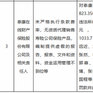 2月8日金融一线消息,国家金融监督管理总局行政处罚信息公示列表显示,泰康在线财产保险股份有限公司及相关责任人存在以下违法违规行为:未严格执行条款费率,无资质代理销售寿险公司保险产品,编制提供虚假的报告、报表、文件和资料,资金运用管理不到位等。
