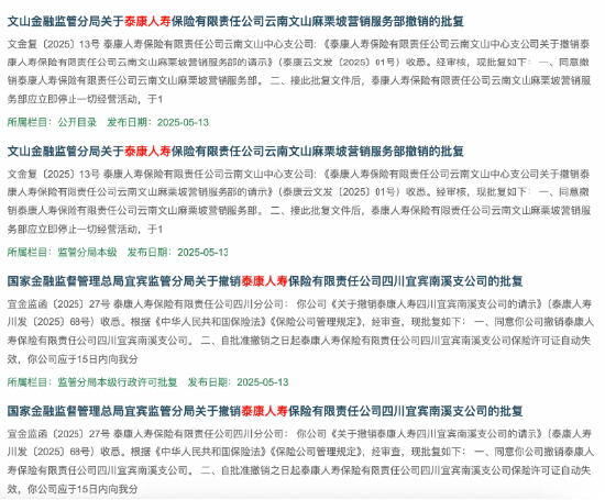 在5月13日,文山金融监管分局同意撤销泰康人寿保险有限责任公司云南文山麻栗坡营销服务部。同一天,国家金融监督管理总局宜宾监管分局同意撤销泰康人寿保险有限责任公司四川宜宾南溪支公司。同时,国家金融监督管理总局遂宁监管分局同意撤销泰康人寿保险有限责任公司四川遂宁沱牌营销服务部。国家金融监督管理总局德阳监管分局同意撤销泰康人寿保险有限责任公司四川德阳黄鹿营销服务部……