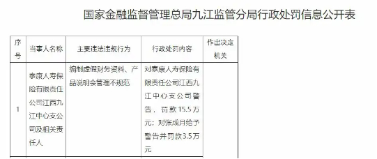实际上,因为违规问题,泰康人寿近期曾被监管部门处罚。今年5月9日,据国家金融监督管理总局行政处罚信息公开表所示,泰康人寿保险有限责任公司江西九江中心支公司及其相关责任人,因编制虚假财务资料、产品说明会管理失范,被九江监管分局予以泰康人寿保险有限责任公司江西九江中心支公司警告并罚款15.5万元;九江监管分局对张成月给予警告并罚款3.5万元。