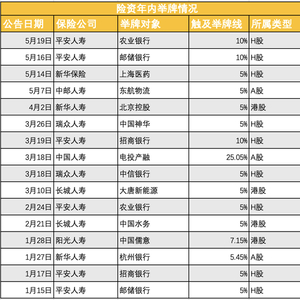 近日险资又掀起一次举牌潮,仅这周以来就有三起举牌事件,而且对象都是H股。5月19日,平安人寿在保险协会官网发布举牌农业银行H股的公告,5月16日平安人寿公告称增持了邮储银行H股。5月14日,新华保险增持上海医药H股触及5%举牌线。