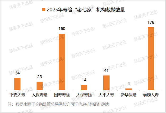 其中,人身险公司为裁撤主力。以寿险“老七家”为例,平安人寿、人保寿险、国寿寿险、太保寿险、太平人寿、新华保险、泰康人寿7家寿险公司,年内合计裁撤454家分支机构,占总裁撤数目的48%,在人身险公司中的占比更是高达60.3%。