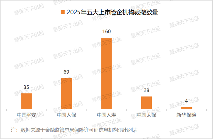 作为行业风向标,过去一段时间,头部上市险企在裁撤分支机构方面动作最为频繁,也颇具代表性。据“慧保天下”不完全统计,2025年以来,五大上市险企累计裁撤分支机构近296家,占全部裁撤数量的31.3%。