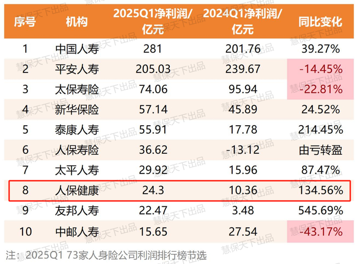 值得关注的是,人保健康也正在打破市场对专业健康险公司盘子不大、规模有限的固有认知,在盈利能力方面“破圈”,挺进人身险公司整体排名前列。据‘慧保天下’对73家有可比数据的人身险公司净利润排名梳理,人保健康在2025年一季度跃居第八,力压友邦人寿、中邮人寿等寿险公司,成为近年来罕见的行业“黑马”。