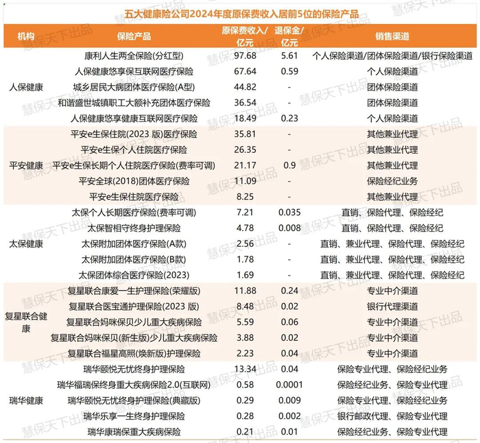 销售渠道方面,五大健康险公司普遍布局多元渠道,包括直销、银保、保险代理、保险经纪等,而互联网渠道则成为不可忽视的“流量引擎”。人保健康原保费前五的产品中,两款即为互联网产品;平安健康的“平安e生保”系列更是百万医疗险市场中的明星产品,四款入围前五。