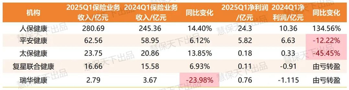 人保健康依旧领跑,其一季度保费收入高达280.69亿元,同比增长14.40%,其规模远超排名第二的平安健康的62.56亿元。太保健康、复星联合健康分列其后,分别为23.75亿元和16.66亿元,同比增长13.85%和6.93%。瑞华健康则出现明显回落,一季度收入为2.79亿元,同比下降23.98%。