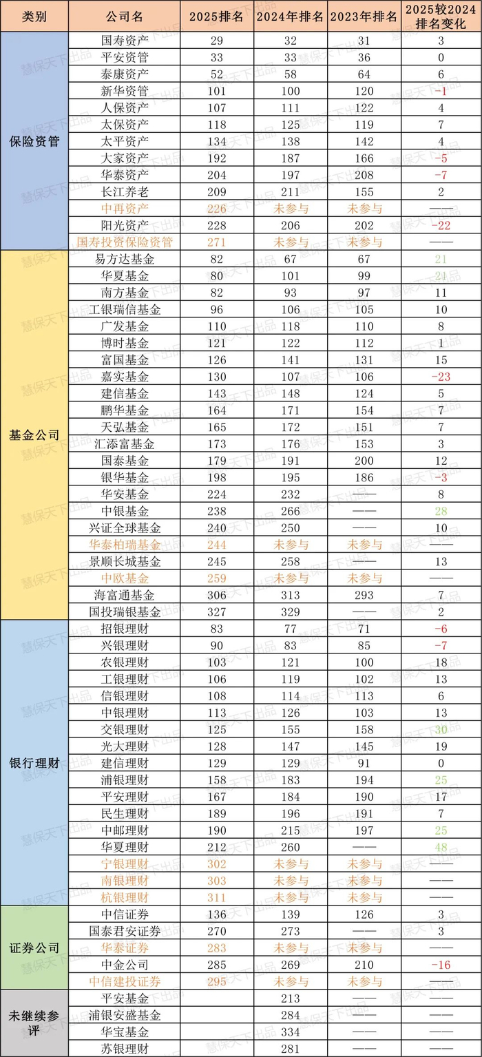 具体来看,与2024年度榜单相比,2025年度新增9家中国机构参评,分别是:中再资产(226名)、国寿投资保险资管(271)、华泰柏瑞基金(244)、中欧基金(259)、宁银理财(302)、南银理财(303) 、杭银理财(311)、华泰证券(283)、中信建投证券(295)。同时,也有4家机构未继续参评,分别是平安基金、浦银安盛基金、华宝基金、苏银理财,这四家公司也是2024年度新参评的机构,它们在2024年的排名分别是213、284、334、281。