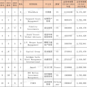 慧保天下根据公开信息,统计了近三年的排名情况,可以看到,2025年榜单中排名全球前五的公司,已经三年没有发生变化,垄断全球资管格局,分别是贝莱德、先锋资产管理、富达投资、道富环球投资管理、摩根大通资产管理。而前10名同样座次固化,变动也只是在内部进行排名调整,仍未有新的玩家进入前10排名。