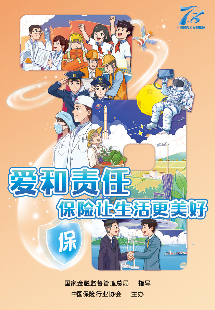 守护美好:海报以温暖的淡橙色为主,以科研工作者、工程师、学生、军人、医生、农民、企业家等各行各业的代表为主线串联,勾勒代表保险公众宣传日的“7.8”标识,体现保险业始终心怀“国之大者”,与国家同行、与时代共进、与民生相融,为服务国家建设、护航人民美好生活贡献力量。