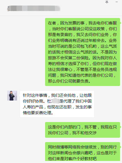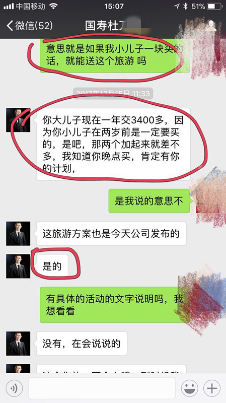 2月6日,漆女士打电话向中国人寿南昌分公司投诉杜姓业务员一直不给她发票,并询问海南旅游事宜,客服却回应称,“公司没有买保险送旅游的活动,您说的可能是业务员自己出资送给客户的活动。”