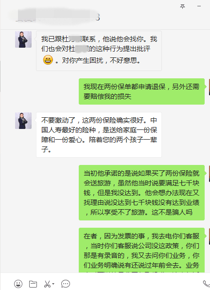 针对漆女士的投诉,新浪金融曝光台致电杜姓业务员, 他表示公司已令他与漆女士进行协商,等元宵节后,待客户消气后会与她沟通。而对于买保险送旅游问题,他表示,在给漆女士送保单时,就曾强调只有他获得海南岛的业绩奖励时,才能送给漆女士。关于退保的问题,他表示漆女士如果要退保的话,一定会亏钱。