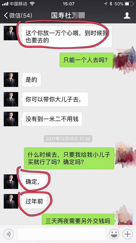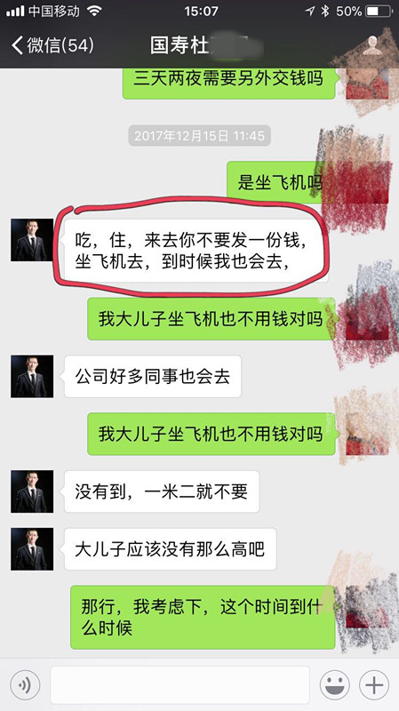 业务员强调:“这个您放一万个心,这个活动我也要去的。”并且他还承诺漆女士,大儿子身高不到1米2也可以免费去,甚至还说,这个活动他本来也要去,但是他可以把这个旅游机会让给漆女士的老公。