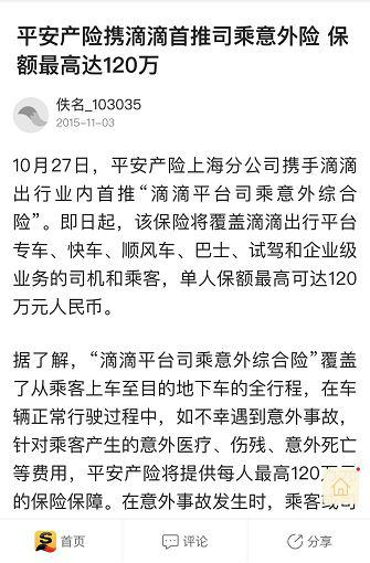 2015年底,滴滴曾高调宣传其与平安产险达成合作,推出“司乘意外险”,保额最高可达120万元。