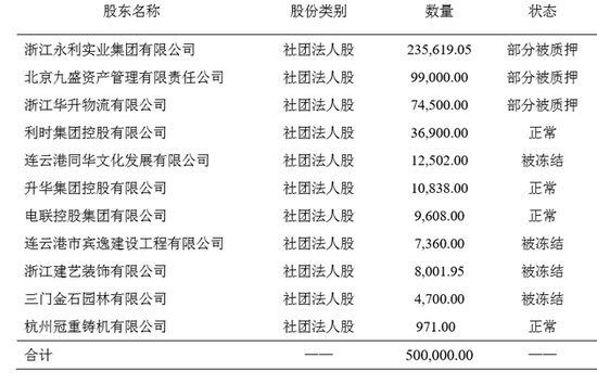 根据信泰人寿三季度偿付能力报告,公司前三大股东——浙江永利实业集团有限公司、北京九盛资产管理有限责任公司、浙江华升物流有限公司的股权状态均为“部分被质押”,此外,连云港同华文化发展有限公司、连云港市宾逸建设工程有限公司、浙江建艺装饰有限公司、及三门金石园林有限公司四家股东的股权状态均“被冻结”,其余四家股东的股权状态为“正常”。