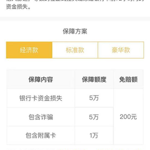 另外,安心保险这款银行卡盗刷险分为经济款、标准款和豪华款,其中经济款“银行卡资金损失”保障内容的保障额度为5万元,此外可以增加“包含诈骗”和“包含附属卡”的保障内容,价格随之有所增加。