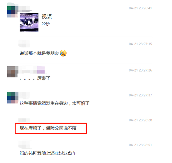据该车主的朋友回忆称,上周五其还乘坐过这个车,这种事情发生在身边表示很可怕。但是其中一句“现在麻烦了,保险公司说不赔”引起了新浪财经的注意。