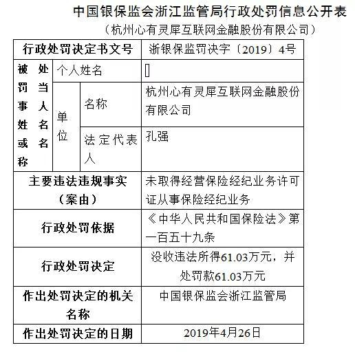 5月6日,浙江银保监局公布了一则处罚信息,杭州心有灵犀互联网金融股份有限公司(下称“灵犀金融”)未取得经营保险经纪业务许可证却从事保险经纪业务,被没收违法所得61.03万元,并处罚款61.03万元。