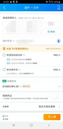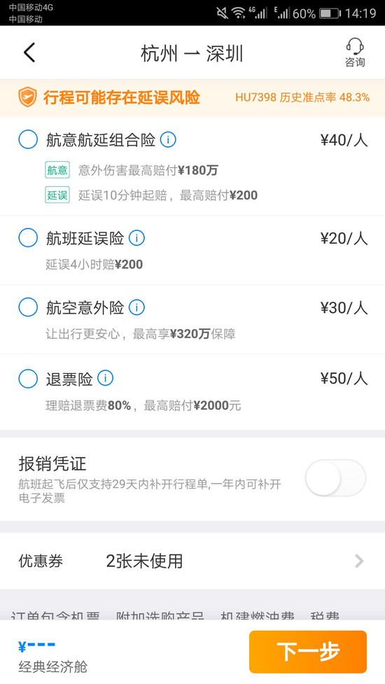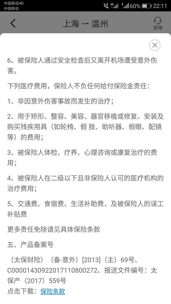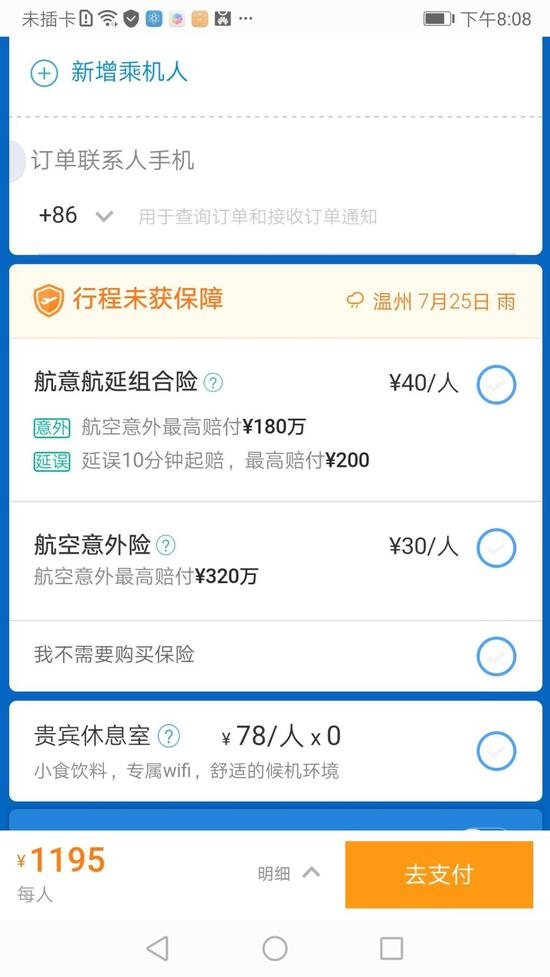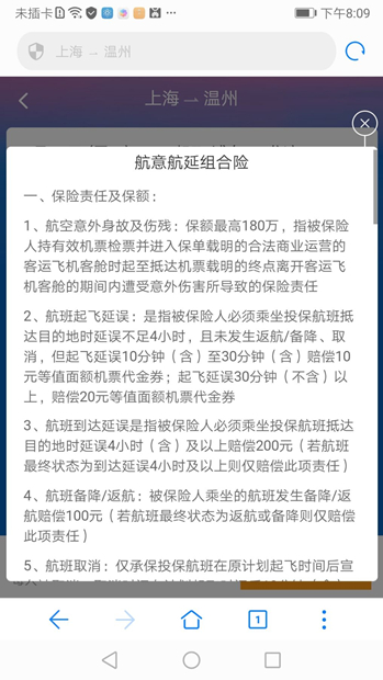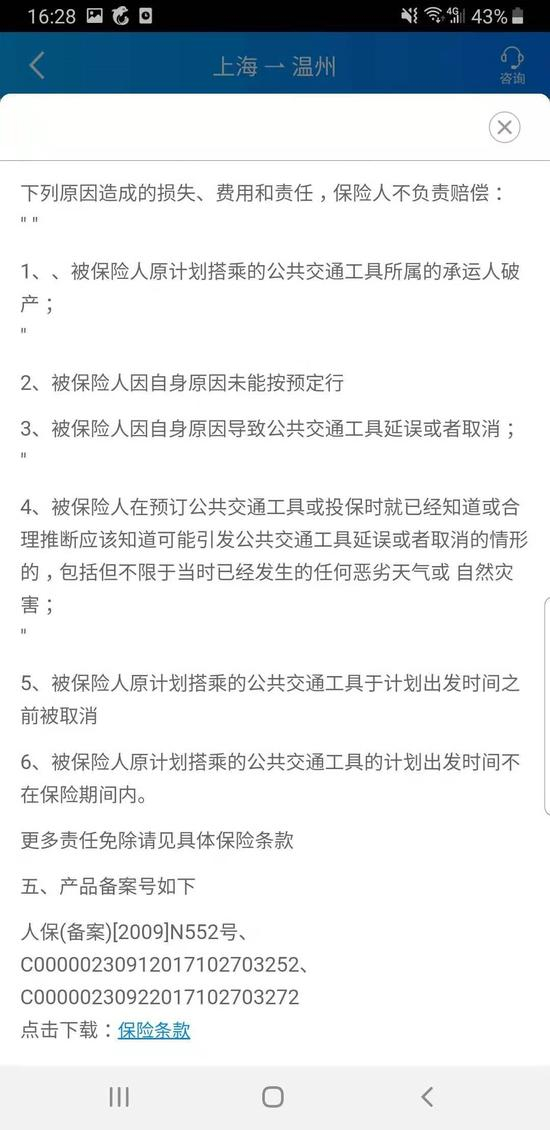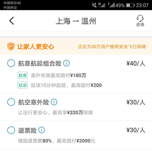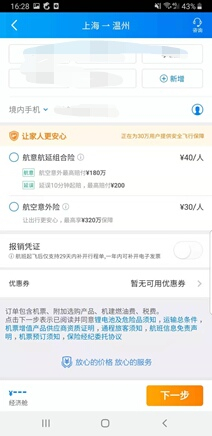 (图片来源:携程APPv8.2.0 上海至温州相同航次经济舱保险售卖详情页面)
