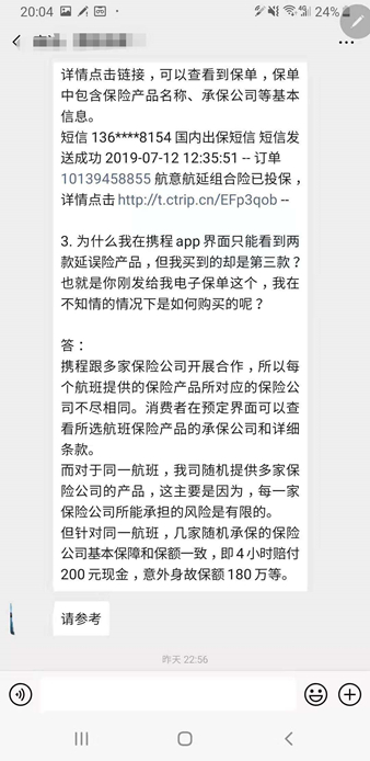 直至7月23日下午5:50,记者再次接到携程公关电话,随后该人士通过微信只把保单信息发送给记者,与订票记者订单中的保单信息一致。但记者在app端仍然看不到人保的在售产品。