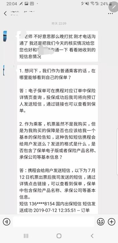 半小时后,记者接到携程另外一位客服的电话,主要是确认是否有截图,并表示尽快回复。随后记者又多次接到携程客服及携程公关电话,内容仍与上述无异,每次承诺短信发送的人保产品链接都未发送。