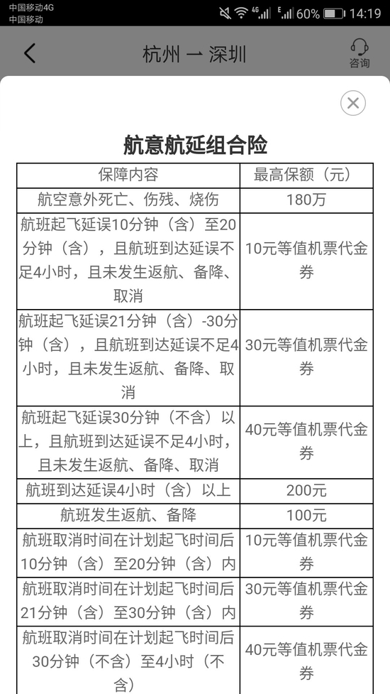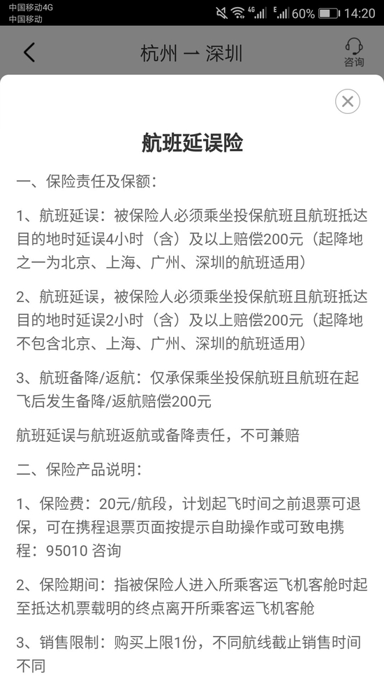 (图片来源:携程APPv8.2.0多航班保险产品信息)