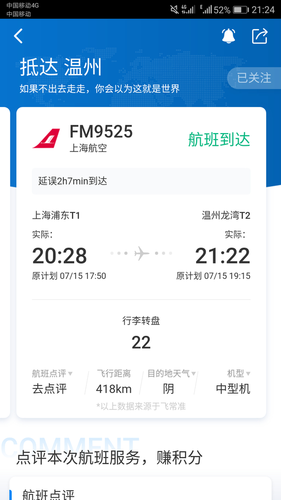 (图片来源:携程APPv8.2.0显示FM9525航班实际到达时间,及理赔信息)