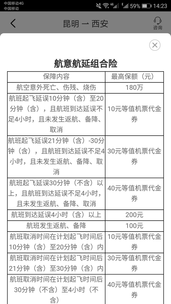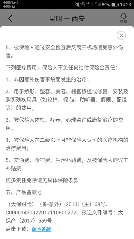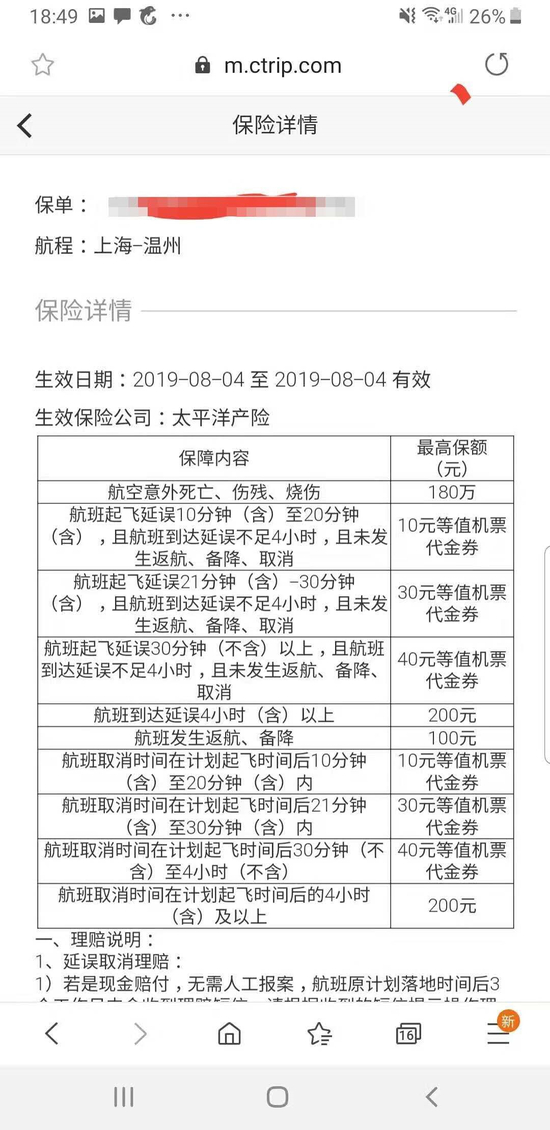 (图片来源:携程APPv8.2.0航意航延险赔付条款)