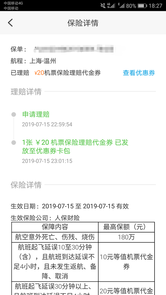 “我们两个人花了80元人民币买了两份保单,延误后总共得到了40元的优惠券,还不是现金,我们之前看的产品可不是这样的。”记者表达不满。