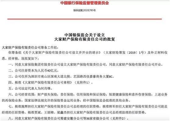 经中国银保监会批准,大家财险由大家保险集团有限责任公司(大家保险集团)设立,注册资本40亿元,经营范围包括:财产损失保险、责任保险、信用保险和保证保险、短期健康保险和意外伤害保险,上述业务的再保险业务,国家法律法规允许的保险资金运用业务,以及经中国银保监会批准的其他业务。此外,大家财险安徽分公司等36家省分公司同时获准筹建。未来,大家财险将立足财产保险主业,为社会公众提供各类财产险产品,着力打造核心服务能力,提升客户感受和体验,切实保护保险消费者合法权益。