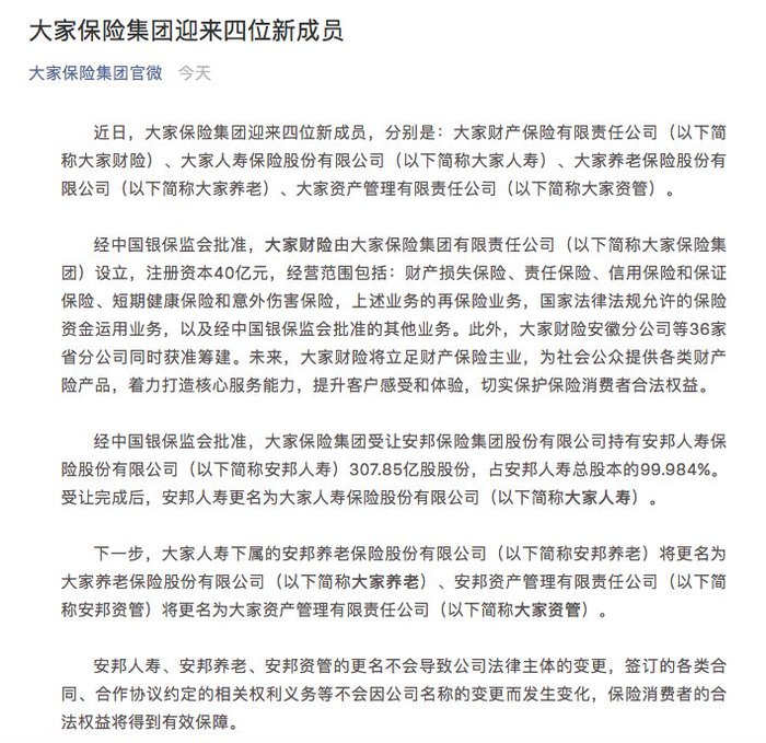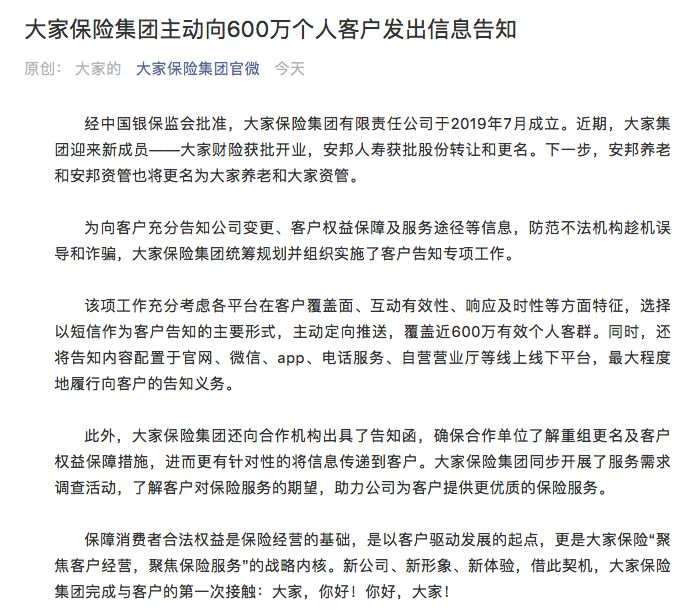 大家保险集团官微也发布《大家保险集团主动向600万个人客户发出信息告知》称:大家财险获批开业、安邦人寿获批股份转让和更名,下一步,安邦养老和安邦资管也将更名为大家养老和大家资管。