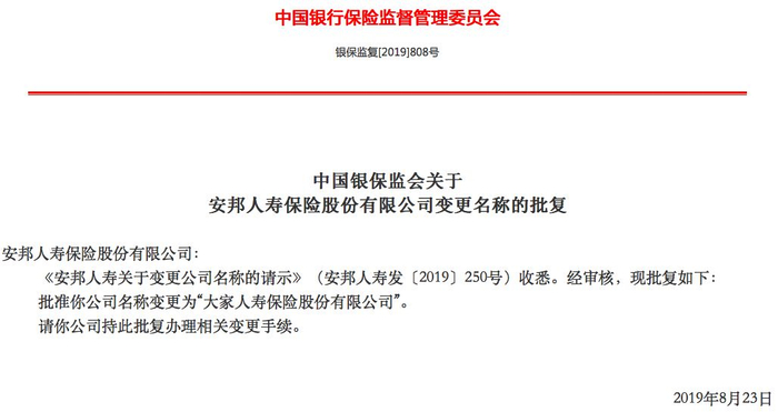 多只安邦举牌股已公告:安邦人寿更名大家人寿、安邦集团变更大家集团