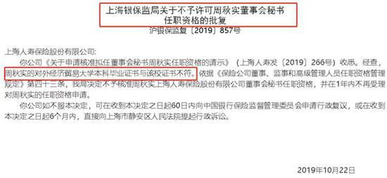 上海人寿本打算让周秋实担任公司副总经理、董事会秘书,结果遭官方打脸。文件表示,周秋实的对外经济贸易大学本科毕业证书与该校证书不符,因此不予核准任职资格。