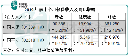 2019年前十个月,中国人保的寿险和健康险保费收入分别增长3.2%及51.98%,至903.86亿元人民币(单位下同)及199.94亿元,财险保费收入同比增长12.46%,至3612.5亿元。与同样公布了前十个月保费收入的中国平安相比,中国人保的寿险和健康险业务明显跑不赢同行,但财险仍稳胜,见下表。