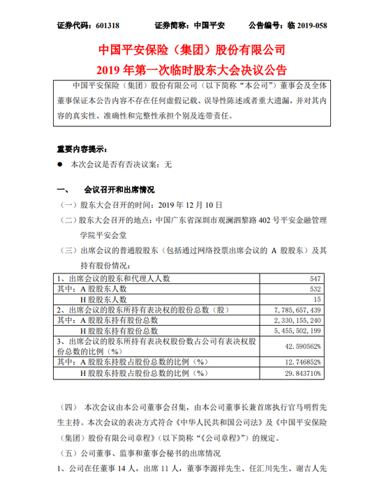 新浪财经讯 12月11日消息,中国平安发布公告称,在2019年第一次临时股东大会上,选举谢永林先生、陈心颖女士为公司执行董事之普通决议案,获二分之一以上投票权投票赞成,故该等普通决议案已获正式通过。
