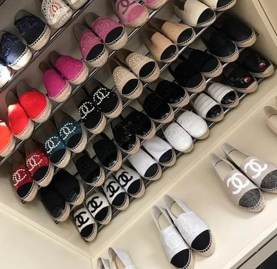 比如,一柜子Chanel帆布鞋;一柜子Gucci毛毛拖;一柜子维密睡衣;一柜子比基尼;一柜子眼镜……